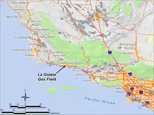 The La Goleta Gas Field (also known as the Goleta Gas Field and La Goleta Storage Field) is a natural gas field in unincorporated Santa Barbara County, California, adjacent to the city of Goleta. Discovered in 1929, and first put into production in 1932, it has been in continuous use ever since, producing approximately 12 billion cubic feet of gas.[1] With production declining, the field was converted into a gas storage reservoir in 1941. As of 2016 it remains one of the four gas storage facilities maintained by Southern California Gas Company (SoCalGas), a division of Sempra Energy, with the others being Aliso Canyon, Honor Rancho and Playa del Rey. It is the oldest storage facility of the four and the third largest, with a maximum capacity of 21.5 billion cubic feet.[2] The storage facilities are necessary to balance load for the over ten million customers of SoCalGas: during summer months, when gas usage is at a minimum, gas is pumped into the reservoirs; and in the winter when usage is high, gas is withdrawn. The La Goleta field serves the northern portion of SoCalGas's geographic range.[2][3]