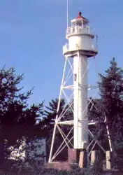 A square wooden tower, constructed in 1858, was located around 3,000 feet (910 m) west of the current light.[5] The previous lens was moved to the Chequamegon Point Lighthouse in 1897. It is one of the Apostle Islands Lighthouses.