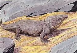 Labidosaurikos is a genus of extinct captorhinid anapsid reptile that lived around 279 to 272 million years ago during Kungurian age of the lower Permian.[3] The American paleontologist John Willis Stovall first described Labidosaurikos in 1950, naming it "Labidosaurus like" for the striking similarity of the holotype skull of his specimen to the cranial anatomy of another captorhinid Labidosaurus hamatus.[4] Labidosaurus or generally called "lipped lizard" is another genus of the family Captorhinidae whose name is derived from the Greek for "forceps lizard" based on (labid-,labis-) τσιμπίδα ("forceps" or "pinsers") and σαυρος (sauros) ("lizard")[5]