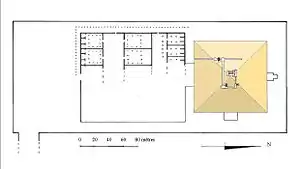 In the 17th century, Claude Sicard suggested that the Labyrinth may have been located at Hawara.[22] Two centuries later, in a volume of Description de l'Égypte (1821), Philippe Joseph Marie Caristie and Edme-François Jomard discussed the location of the Labyrinth in an extended consideration of the Hawara site; Eric P. Uphill has thus argued that Jomard and Caristie's chapter was consequently "the first published description of ... the Labyrinth site [that] distinguish[ed] the salient features [of the structure] correctly".[23][24] Subsequent works postulated that the ruins south of the Pyramid of Amenemhat III were in fact the remains of the Labyrinth, including brief reports by Howard Vyse and John Shae Perring (1842) and John Gardner Wilkinson (1843).[25][26][24]