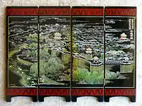 Making a lacquer painting may take several months depending on the technique used and the number of layers of lacquer. In Vietnam's sơn mài lacquer painting, a black board is prepared first. Then colour chalks are used on the prepared board for base sketch. Needles can also be used for carving the base sketch as an alternative. In lacquer painting, eggshells are used as white colour due to the lack of pure white colour in lacquer. Layers of clear varnish can be applied optionally depending on the purpose of the painting. Polishing is done in the end to reveal the different layers of colours applied before. The first layer of coloured lacquer is applied, usually followed by silver leaf and another layer of clear lacquer. Then several more layers of different coloured lacquers are painted by a brush, with clear lacquer layers between them. In Vietnam, an artist may apply up to ten layers or more of coloured and clear lacquer. In Ming China artwork, up to a hundred layers are included. Each layer requires drying and polishing. When all layers are applied, the artist polishes different parts of the painting until the preferred colours are shown. Fine sandpapers, a mix of charcoal powder and human hair are used to carefully reach the correct layer of each specific colour.[2] Consequently, "lacquer painting" is in part a misnomer, since the bringing out of the colours is not done in the preparatory painting but in the burnishing of the lacquer layers to reveal the desired image beneath.[3] Therefore, lacquer painting is considered a "subtracting method" of drawing technique.