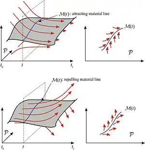 Heuristically, one may seek initial positions of repelling LCSs as set of initial conditions at which infinitesimal perturbations to trajectories starting from grow locally at the highest rate relative to trajectories starting off of .[1][15] The heuristic element here is that instead of constructing a highly repelling material surface, one simply seeks points of large particle separation. Such a separation may well be due to strong shear along the set of points so identified; this set is not at all guaranteed to exert any normal repulsion on nearby trajectories.
