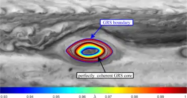 Trajectories of are referred to as -lines. Remarkably, they are initial positions of material lines that are infinitesimally uniformly stretching under the flow map . Specifically, any subset of a -line is stretched by a factor of between the times and . As an example, Fig. 13 shows elliptic LCSs identified as closed -lines within the Great Red Spot of Jupiter.[35]