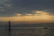 No Paleolithic finds have been made in the immediate vicinity of the lake, because the region of Lake Constance was long covered by the Rhine Glacier. The discovery of stone tools (microliths) indicate that hunters and gatherers of the Mesolithic period (Middle Stone Age, 8,000–5,500 BC) frequented the area without settling, however. Only hunting camps have been confirmed. The earliest Neolithic farmers, who belonged to the Linear Pottery culture, also left no traces behind, because the Alpine foreland lay away from the routes along which they had spread during the 6th millennium BC.[14] This changed only in the middle and late Neolithic when shore settlements were established, the so-called pile dwelling and wetland settlements, which have now been uncovered mainly on Lake Überlingen, the Constance Hopper and on the Obersee. At Unteruhldingen, a pile dwelling village has been reconstructed, and now forms an open air museum. In 2015, a 20 km line of about 170 man-made under-water stone mounds dated in the neolithic period or early bronze age were discovered on the south-west shore of the lake between Bottighofen and Romanshorn.[15][16][17][18][19]