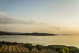 Lake Uluabat (Turkish: Uluabat Gölü and Apolyont Gölü) is the name of a freshwater lake in the vicinity of Bursa, Turkey. It is a large lake, covering an area of between 135 and 160 km2 depending on the water level, but very shallow, being only 3 m deep at its deepest point. The lake contains eight islands and one other that is sometimes an island and sometimes a peninsula. The largest island is known as Halilbey Island. In the southwest the lake is fed by the Mustafakemalpaşa River, which has formed a silty delta. Water leaves the lake by way of the Ulubat stream, flowing to the west, and reaches the Sea of Marmara via the Susurluk River.[2]