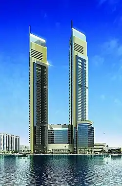 Sumou Towers (formerly Lamar Towers) are a pair of skyscrapers currently under construction in the city of Jeddah, Saudi Arabia.[3][4] Located on Jeddah Corniche, Sumou Towers consists of two towers, the southern tower 71 floors and the northern 62 floors. The project also includes a number of commercial offices and at the same time it includes a commercial shopping center (mall) that includes the most luxurious shops and international restaurants, in addition to a sports center, spa and multiple areas for luxury.