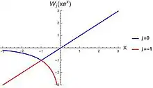 A plot of Wj(x ex) where blue is for j=0 and red is for j=−1. The diagonal line represents the intervals where Wj(x ex)=x