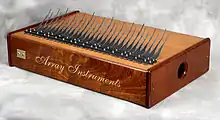The Array Mbira is a lamellophone with an alternate tine configuration. It is electrified by the addition of a 2-channel stereo piezo cable pickup system. A special solid-body Array mbira exists.