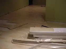 Laminate flooring (also called floating wood tile in the United States) is a multi-layer synthetic flooring product fused together with a lamination process. Laminate flooring simulates wood (or sometimes stone) with a photographic applique layer under a clear protective layer. The inner core layer is usually composed of melamine resin and fiber board materials.[1] There is a European Standard No. EN 13329:2000 specifying laminate floor covering requirements and testing methods.