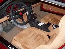 The Stradale's chassis was a space frame, similar to its rally counterpart, built out of CrMo steel tubes and aluminium alloy for the crash structures; it was covered by epoxy and fiberglass body panels. Like the rally car, the 1.8-litre four-cylinder engine was longitudinally mid-mounted, equipped with Weber-Marelli IAW integrated electronic ignition and fuel injection, a supercharger, a turbocharger and two intercoolers. In road tune the 1.8 produced 250 PS (184 kW; 247 hp)[8] at 6750 rpm and 291 N⋅m (215 lb⋅ft) of torque at 4500 rpm.[6] The "Stradale" kept a three differential four-wheel-drive system from the rally car; the centre differential sent 30% of the engine torque to the front open differential, and 70% to the rear limited slip. The transmission remained a 5-speed but was a fully-synchronized unit built by CIMA.[3][9]