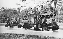 The weather continued to hamper the 9th Division's advance. The 26th Brigade, further inland, remained stuck on the eastern side of the Busu. On 10 September, the commandos providing flank security managed to get across the Sankwep River, close to its confluence with the Busu, pushing a kunda bridge across. Shortly afterwards, they clashed with a small party of Japanese attempting to advance towards the bridge, and several Japanese were killed.[66] To reinvigorate the 26th, engineer support was brought up. The 2/7th Field Company was pushing a jeep track forward with the help of the 2/48th, and they subsequently arrived with boats, ropes and cables, and several attempts were made to get across, all of which eventually failed as the engineers came under fire from the opposite bank. Heavy clashes later took place as the Australians and Japanese fought desperately in the swamp around the crossing.[67] As it became uncertain whether the 26th would be able to force their way across, a company from the 2/48th was sent south to use the 24th Brigade's crossing and then advance north along the western bank of the Busu to help secure the brigade's beachhead when it finally did get across. on 13 September further engineer stores arrived, including bridging equipment and folding boats, and the following day a Small Box Girder bridge was pushed across despite heavy fire from the opposite bank, allowing the 26th Brigade to get across the Busu on 14 September.[68][69]