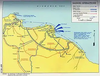 Maps were supplied by the Australian Survey Corps.[9] There was insufficient time and opportunity for ground reconnaissance, so three beaches, codenamed Red, White, and Blue, on the west shore of Dekays Bay were chosen from aerial photographs.[10] They proved to be "narrow, rocky and exposed to heavy seas".[11] The intelligence staff at GHQ in Brisbane believed that there were no more than 4,500 Japanese forward of Sio, and only 1,500 more between there and the Madang area. They estimated that if the Japanese decided to counter-attack at Saidor, they would take a week to bring up 3,000 men.[12] Accordingly, Martin elected to dispense with a preliminary aerial bombardment. Removing this requirement permitted a dawn landing.[10]