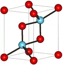 At low temperatures, La2O3 has an A-M2O3 hexagonal crystal structure. The La3+ metal atoms are surrounded by a 7 coordinate group of O2− atoms, the oxygen ions are in an octahedral shape around the metal atom and there is one oxygen ion above one of the octahedral faces.[4] On the other hand, at high temperatures lanthanum oxide converts to a C-M2O3 cubic crystal structure. The La3+ ion is surrounded by six O2− ions in a hexagonal configuration.[5][6]