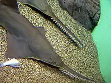 The largetooth sawfish is a predator that feeds on fish, molluscs and crustaceans.[4] The "saw" can be used both to stir up the bottom to find prey and to slash at groups of fish.[6][12] Sawfish are docile and harmless to humans, except when captured where they can inflict serious injuries when defending themselves with the "saw".[12][26]