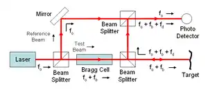 A vibrometer is generally a two beam laser interferometer that measures the frequency (or phase) difference between an internal reference beam and a test beam. The most common type of laser in an LDV is the helium–neon laser, although laser diodes, fiber lasers, and Nd:YAG lasers are also used. The test beam is directed to the target, and scattered light from the target is collected and interfered with the reference beam on a photodetector, typically a photodiode. Most commercial vibrometers work in a heterodyne regime by adding a known frequency shift (typically 30–40 MHz) to one of the beams. This frequency shift is usually generated by a Bragg cell, or acousto-optic modulator.[1]