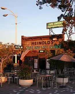 The second is the "Heinold's First and Last Chance" in Oakland, California. It was opened in 1883. Located on the docks of Oakland, it would have been the last chance for drinkers to imbibe before falling under the jurisdiction of their boat's captain. While it was not a legally dry area, a boat could often be practically dry. Even if a captain chose to allow alcohol, it would have been relatively scarce and usually tightly regulated—if the boat's hold had space for it at all. Thus, Heinold's saloon served precisely the same practical function as the Caldwell example. It was made arguably more famous because noted American author Jack London was an irregular patron. When in Oakland, London drank there often, gleaning insight from the tales of world-traveling sailors.[2] Not only is the saloon commemorated by name in London's works, it is recognized by the California State historical marker program, the National Literary Landmark scheme, and the National Register of Historic Places. Nevertheless, it continues as a working business, maintained privately for the benefit of locals and tourists.