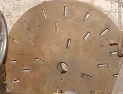 The faceplate was the ancestor of lathe chucks, an arrangement of three or more adjustable 'dogs' bolted to the faceplate providing a primitive chuck arrangement. The smaller plate in the upper photo is specifically a 'dog face' with slots intended to hold a bent tail dog while the work itself was supported on centers. The larger plate to the right simply provides a variety of ways by which work can be bolted or clamped to the plate. The slotted plate on the lower photo accepts wedged holders which can be used to fasten the work to the plate. The plates were expendable, so it was not unusual as shown in both photos for a machinist to drill additional holes in the plates for attaching work that could not otherwise be attached. While the dog plates were usually fairly small regardless of the lathe size, the classic face plate is usually matched to the maximum diameter that the lathe will swing.