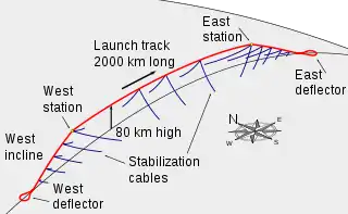 A launch loop, or Lofstrom loop, is a proposed system for launching objects into orbit using a moving cable-like system situated inside a sheath attached to the Earth at two ends and suspended above the atmosphere in the middle. The design concept was published by Keith Lofstrom and describes an active structure maglev cable transport system that would be around 2,000 km (1,240 mi) long and maintained at an altitude of up to 80 km (50 mi). A launch loop would be held up at this altitude by the momentum of a belt that circulates around the structure. This circulation, in effect, transfers the weight of the structure onto a pair of magnetic bearings, one at each end, which support it.