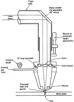 As far as cutting tools are concerned, the most common are scissors, cutters, knives and saws. More automatized alternatives are die-cutting systems, which allow higher production rates to be reached while limiting overall costs, as they allow more layers of fabric to be cut simultaneously. These methods require different skills from the operator and provide different finish precisions, but they all are mechanical procedures and have one major disadvantage in common: the physical contact between the cutting tool and the fibres.[4] An alternative process with less friction is the ultrasound method, which consists of cutting the fabrics with a blade actuated by high-frequency mechanical vibrations, produced by an internal source integrated into the system.[1] There are also completely contact-free cutting techniques, such as laser cutting and water jet cutting, both usually embedded on CNC machines. The former is obtained through a convergent radiation beam which vaporizes the material underneath and uses pressurized gas to remove the volatile particles and the melted material. The latter is based on a high-pressure liquid beam which reaches a velocity of 2.5 times the speed of sound, creating a pressure on the fabric which is higher than the compression resistance of the material and resulting in a net cut. Both these methods share a common disadvantage which needs to be considered before choosing the cutting methods: the beams create high-temperature areas along the cut axes, in which the physical characteristics of the material can be altered significantly.[1][5]