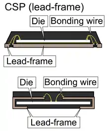Most kinds of integrated circuit packaging are made by placing a silicon chip on a lead frame, wire bonding the chip to the metal leads of the lead frame, and covering the chip with plastic. The metal leads protruding from the plastic are then either "cut long" and bent to form through-hole pins, or "cut short" and bent to form surface-mount leads. Such lead frames are used for surface mount packages with leads – such as Small Outline Integrated Circuit Quad Flat Package – and for through-hole packages such as dual in-line package – and even for so-called "leadless" or "no‑lead" packages[1][2] – such as Quad Flat No‑leads package.