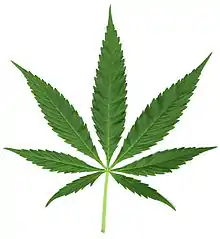 A leaflet (occasionally called foliole) in botany is a leaf-like part of a compound leaf.[1] Though it resembles an entire leaf, a leaflet is not borne on a main plant stem or branch, as a leaf is, but rather on a petiole or a branch of the leaf.[2] Compound leaves are common in many plant families and they differ widely in morphology.[3] The two main classes of compound leaf morphology are palmate and pinnate. For example, a hemp plant has palmate compound leaves, whereas some species of Acacia have pinnate leaves.