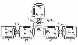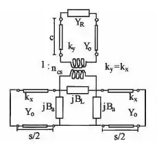 The structure is depicted in the inset of Fig. 8. The transverse equivalent network for this new antenna structure is slightly more complicated than the previous, and the expressions for the network elements must be appropriately modified to take the dielectric medium into account. Moreover, above the transformer, an additional susceptance appears.