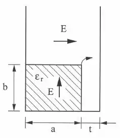 Another possible mechanism is asymmetry. In the asymmetrical NRD-guide antenna depicted in Fig. 4, the structure is first bisected horizontally with a metallic wall, to provide radiation from one end only; since the electric field is purely vertical at this midplane, the field structure in not altered by the bisection. An air gap is then introduced into the dielectric region to produce asymmetry. As a result, a small amount of net horizontal electric field is created, which produces a mode in the parallel-plate air region, which is a TEM mode, which propagates at an angle between the parallel plates until it reaches the open end and leaks away. It is necessary to maintain the parallel plates in the air region sufficiently long so that the vertical electric-field component of the original mode (represented in the parallel-plate guide by the below-cutoff TM1 mode) has decayed to negligible values at the open end. Then the TEM mode, with its horizontal electric field, is the only field left at the antenna aperture, and the field polarization is then essentially pure (the discontinuity at the open end does not introduce any cross-polarized field components).