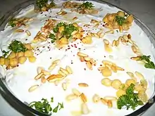 Cheese, as well as yogurt and eggs, are commonly used in Lebanon. One of the more recognizable dishes within Lebanon is labneh. Unlike regular yogurt, labneh is strained so as to remove the watery whey, leaving a thicker, creamier consistency. It is spreadable and garnished with olive oil and sea salt.[44] It is an extremely versatile dish that can be served in a mezze platter for either breakfast or dinner. A variant is mixed with garlic.[44] Ejjeh is the traditional omelette of Lebanon.[45] It is made with egg, chopped parsley and scallions. Within Lebanon, people make this omelette with different herbs that are cultivated from their village.[46][47]