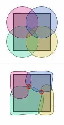 The top half of the second image shows a cover (colored) of a planar shape (dark), where all of the shape's points are contained in anywhere from one to all four of the cover's sets. The bottom illustrates that any attempt to refine said cover such that no point would be contained in more than two sets—ultimately fails at the intersection of set borders. Thus, a planar shape isn't "webby": it cannot be covered with "chains", per se. Instead, it proves to be *thicker* in some sense. More rigorously put, its topological dimension must be greater than 1. |