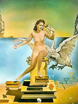 Leda Atomica is a 1949 painting by Salvador Dalí. The picture depicts Leda, the mythological queen of Sparta, with the swan. Leda is a frontal portrait of Dalí's wife, Gala, who is seated on a pedestal with a swan suspended behind and to her left. Different objects such as a book, a set square, two stepping stools and an egg float around the main figure. In the background on both sides, the rocks of Cap Norfeu (on the Costa Brava in Catalonia, between Roses and Cadaqués) define the location of the image.