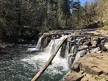 Lee Falls is a waterfall on the Tualatin River in Washington County in the U.S. state of Oregon. Named after 19th century sawmill owner James A. Lee, it is located alongside Southwest Lee Falls Road on private timber land.[2][3] The falls pour over a basalt rock formation.[4] Unusually for the region, the falls are wider than they are tall.[5] A swimming hole is present beneath the falls. Downstream are Little Lee Falls and the unincorporated community of Cherry Grove. Upstream is Ki-a-Kuts Falls.