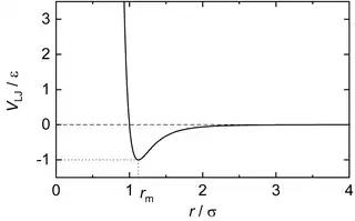 where r is the distance between two interacting particles, ε is the depth of the potential well (usually referred to as 'dispersion energy'), and σ is the distance at which the particle-particle potential energy V is zero (often referred to as 'size of the particle'). The Lennard-Jones potential has its minimum at a distance of where the potential energy has the value