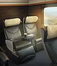 Initially, LEO Express operated five Stadler Flirt five-car electric multiple units, which been specially adapted to perform long-distance services.[4] These have been claimed by the company to provide the fastest acceleration of any train operating in the Czech Republic, achieved via its modern and lightweight design and relatively powerful engines; these are also capable of attaining maximum permittable national speed of 160km/h.[10] The interior has been designed for intercity travellers, and has been configured to provide three travelling classes: Economy, Business and Premium. In Premium Class, the seats are foldable to a sleeping position.[24] Various amenities are present on these trains, including full air conditioning, WiFi coverage, information and entertainment systems, onboard catering, ecologically closed toilets, wheelchair-accessible facilities, and daily newspapers and magazines.[10][25] The livery used by LEO Express is predominantly black with golden details, along with the company's white logo being placed in prominent locations. On 5 February 2012, the first of these trains was formally delivered to the company.[26]
