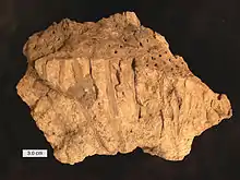 The reproductive organs of the Lepidodendrids consisted of strobili or cones on distal branches in the crown. In Synchysidendron the cones occur on late-formed crown branches, while in Diaphorodendron the cones occur on deciduous lateral branches.[20] The cones could grow to be considerably large, as in Lepidostrobus goldernbergii specimens are over 50 cm (20 in) long. The cones consist of a central axis with sporophylls arranged helically; sporangia are on the adaxial surface of the sporophylls and are upturned distally to overlap sporophylls above. Part of the sporophyll typically extends downward to create a heel or other distal extension. A ligule can be found in a small pit distal to the sporangium. Though Lepidostrubus is the most common name for Lepidodendrales cones, the name has been used for specimens of any form of preservation and for both monosporangiate and bisporangiate forms, so taxonomic problems often ensue.[6] Attempts to dissuade these taxonomic confusions have been made. Some have suggested the name Lepidostrobus should only describe monosporangiate cones and the name Flemingites describe bisporangiate cones, while others have used cone morphology to attempt to better differentiate species within Lepidostrobus.[21][22]