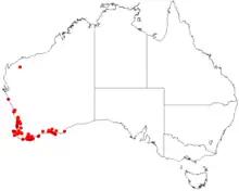 The rhizomatous sedge typically grows to a height of 0.5 metres (1.6 ft) and to about 0.3 m (1.0 ft) wide. In Western Australia it is found along the coast on steep slopes as two separate populations in the Peel and Great Southern regions where it grows in sandy-clay-loam soils over or around granite.[1]