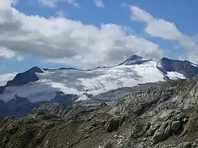 Following the line marking the division of the waters that flow into the Po from those that feed the Rhone or the Rhine, the main ridge of the Lepontine Alps describes a somewhat irregular curve, convex to the north, from the Simplon Pass to the Splugen Pass. With the single exception of the Monte Leone, overlooking the pass of the Simplon, the summits of this portion of the chain are much inferior in height to those of the neighbouring chains; but two peaks of the Adula group, culminating at the Rheinwaldhorn, exceed 11,000 feet (3,400 m) in height.[1]
