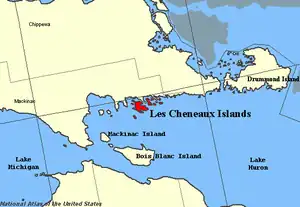 Les Cheneaux Islands (French: "The Channels") are an archipelago of 36 small islands, some inhabited, along 12 miles of Lake Huron shoreline on the southeastern tip of the Upper Peninsula of Michigan in the United States. The name is French for "the Channels", noting the many channels between the islands in the group.[1] They are about 30 miles northeast of Mackinac Island and about 35 miles south of Sault Ste. Marie. The islands are a popular resort and boating and kayaking area. The nearby communities of Hessel and Cedarville on the mainland offer marinas, camping, lodging, restaurants, and shopping. The Les Cheneaux Islands Antique Boat Show & Festival of the Arts has been held on the second Saturday of each August since 1976 in Hessel. It is the world's largest antique wooden boat show.