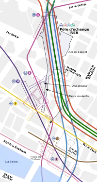 The station redesign includes new entrances on Rue Berger, Rue Rambuteau, and Place Marguerite de Navarre, an expanded RER concourse, and improved pedestrian circulation. Construction began in 2010 on a project which includes the gardens, Forum, and station, to continue through 2016. The clients are the City of Paris, RATP, which operates the Paris Metro, and La Société Civile du Forum des Halles de Paris, which operates the Forum.[9]