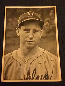 Through the first two months of the season he performed well in relief. On May 26, however, Webber had the worst outing of his career against the Pittsburgh Pirates. In a 17–4 loss, Webber pitched 1+2⁄3 innings in relief of Max Macon, and gave up nine walks and ten runs, making his ERA jump from 1.59 to 5.18. Durocher was criticized after the game for leaving Webber in as long as he did.[9] Despite the poor outing, Webber remained in his role through the rest of the season. After an early August game against the St. Louis Cardinals, he was fined $100 for intentionally throwing at Stan Musial on two back-to-back pitches, which Durocher defended after claiming that he was not intentionally throwing, but simply throwing high and inside to Musial as he had told him to do. This was dismissed by Commissioner Ford Frick, as Webber had thrown at Musial before in 1941, when both were minor leaguers.[10][11] Webber finished the season with two wins, two losses, a 3.81 ERA, and 10 saves, which led the National League.[7] He appeared in 54 games for the Dodgers that year, a team record that stood until 1952 when it was broken by Joe Black.[12]