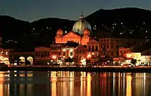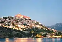 Lesbos prospered from trade, and Mytilene was considered the busiest port in the Aegean Sea. West European representatives are attested in the city already in 1700, acting as vice-consuls for the consulates in Smyrna. The island exported olives and olive oil, wheat, grapes, raisins and wine, figs, fish, dairy products, acorns, soap, leather and hides, pitch and livestock.[11] Mytilene itself increased five-fold in population during the Ottoman period. A number of new mosques were erected in the city, and Barbaros Kayreddin built a madrasa, dervish lodge, and imaret erected in his home town.[7] Many of the early Ottoman buildings, as well as the city walls, were destroyed in the earthquake of 1867.[7] Mevlevi and Bektashi lodges are attested, since 1544 for the former, and since 1699 for the latter.[7] Molyvos, which was the island's second city for most of the Ottoman period, also experienced growth, doubling in size; unlike Mytilene, the Muslim element came to predominate, and comprised over half the population by 1874. Mosques were built and fortifications undertaken during the long Cretan War (1645–1669) with Venice. But during the 19th century, the town declined rapidly in importance and number of inhabitants, a decline which continued to modern times.[7] In the mid-18th century, the castle and settlement of Sigri were established to protect the western coast from pirate attacks.[7]