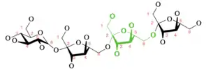 Levan is a naturally occurring fructan present in many plants and microorganisms.[1] This polymer is made up of fructose, a monosaccharide sugar, connected by 2,6 beta glycosidic linkages. Levan can have both branched and linear structures of relatively low molecular weight.[2] Branched levan forms a very small, sphere-like structure[3] with basal chains 9 units long. The 2,1 branching allows methyl ethers to form and create a spherical shape. The ends of levan also tend to contain a glucosyl residue.[4] Branched levan tends to be more stable than the linear structure.[5] However, the amount of branching and length of polymerization tends to vary among different species.[4] The shortest levan is 6-kestose, a chain of two fructose molecules and a terminal glucose molecule.