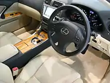 The second generation IS interior features leather seats, lightsaber-like electroluminescent instrument display lighting and LED interior lighting accents, 10-way (including lumbar) driver and front passenger power seats, and the choice of faux-metallic or optional Bird's Eye Maple wood grain trim made by Yamaha piano craftsmen from sustainable plantations.[17] The interior design also derived elements from Japanese concepts, including hazushi, where an object retains individuality while being part of a large whole, as typified in side air vents.[18] Other available interior features include perforated leather seats, heated and ventilated front seats, power tilt/telescoping steering wheel, moonroof, electrochromic side view mirrors, power rear sunshade, and aluminum scuff plates.