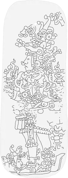 The front face has a picture of a richly-dressed man. His head and the lower part of his body are seen from profile, but his breast is turned toward the front, with the feet placed one behind the other.[13] It represents a victorious lord, possibly an otherwise-unknown ruler of Tikal,[11] wearing six celts and some trophy heads around his waist, standing with bound captives he vanquished.[14][8] He also carries an atlatl, or two head serpent, in his hand.[15][14] The serpents have a human head in their mouth, a characteristic feature of the Sun God.[13][5] The motif of the inauguration of a ruler depicted on the Leiden Plate is a common one, similar carvings being found on stelae and other celts around the Maya world.[10]