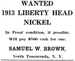 The first information that a 1913 Liberty head nickel might have been struck came in December 1919, when coin dealer Samuel W. Brown placed advertisements in numismatic publications, offering to buy any such nickels. In August 1920, Brown displayed one such coin at the annual American Numismatic Association (ANA) convention.[34] Brown related that a master die had been prepared for the 1913 Liberty head nickels, and a few pieces had been run off to test the die.[35] As it turned out, Brown possessed five coins, which he eventually sold. After spending fifteen years in the hands of the eccentric Col. E.H.R. Green, the famous Fort Worth, Texas, area collector, the coins were finally dispersed in 1943. Since then, the coins have had several owners each. Today, three are on public display, one at the Smithsonian Institution in Washington, DC and two reside at the ANA's Money Museum in Colorado Springs, while two are owned privately. One price recorded for a 1913 Liberty Head nickel was in January 2010, when one sold for $3,737,500 in an auction. [36] Recent sales of a 1913 Liberty Head nickel were in April 2013 for more than $3.1 million[37] and for $4.5 million at auction in August 2018.[38]