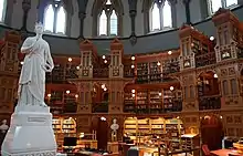 The main reading room rises to a vaulted ceiling and the walls and stacks are lined with white pine panelling carved into a variety of textures, flowers, masks, and mythical creatures. In the galleries are displayed the coats of arms of the seven provinces that existed in 1876, as well as that of the Dominion of Canada, and standing directly in the centre of the room is a white marble statue of Queen Victoria, sculpted by Marshall Wood in 1871.[5] The northern galleries are also flanked with the white marble busts of Sir John Sandfield Macdonald; Prince Edward, Prince of Wales (later King Edward VII); Alexandra, Princess of Wales (later Queen Alexandra); and Sir Étienne-Paschal Taché.[7]