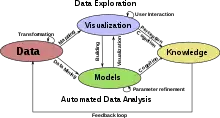A visual analytics (VA) workflow diagram - Augmented reality (AR) and Mixed reality (MR) allow interaction with real and virtual objects in a given environment. In the interpretation phase of LCA, where inventories and process impacts are considered, AR/MR facilitates interaction with complex data sets to investigate scenarios and validate assumptions. It has the potential to break down barriers that inhibit the flow of information.[11]