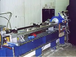 Arnold Air Force Base's Range-G is the "largest routinely operated two-stage, light-gas gun system in the United States".[2] Range-G utilizes interchangeable launch tubes ranging from a bore diameter of 3.3 inches (84 mm) to 8.0 inches (200 mm) with a 14.0-inch (360 mm) piston weighing up to 2,300 pounds (1,000 kg). Projectile velocities can reach 4.5 kilometres per second (16,000 km/h) for the 8.0-inch (200 mm) configuration and 7 kilometres per second (25,000 km/h) for the 3.3-inch (84 mm) launcher configuration.[2] The primary use of the range facilities at Arnold Air Force Base is the measurement of released kinetic energy upon projectile impact.