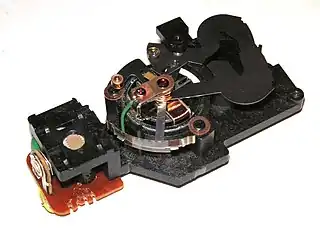 An automatic light meter/exposure unit from an 8 mm movie camera, based on a galvanometer mechanism (center) and a CdS photoresistor, in opening at left.