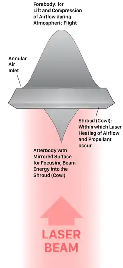 A ground-based laser aims a high power pulse to the mirror stern. The beam is reflected and focuses to heat the air at an extremely high temperature up to 30,000 degrees, transforming it in a plasma that violently expands, pushing the craft forward. Air is renewed through the inlet and the cycle is repeated at high frequency, acting as an external pulse detonation engine producing thrust.[7]
