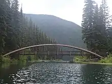 The lake is skirted by a 9 km level-grade hiking-only trail, which can be halved by taking the Rainbow Bridge at the narrows of the lake. The day-use parking area serves also as a parking area for the Windy Joe, Mount Frosty, and Lightning Lakes Chain hike.